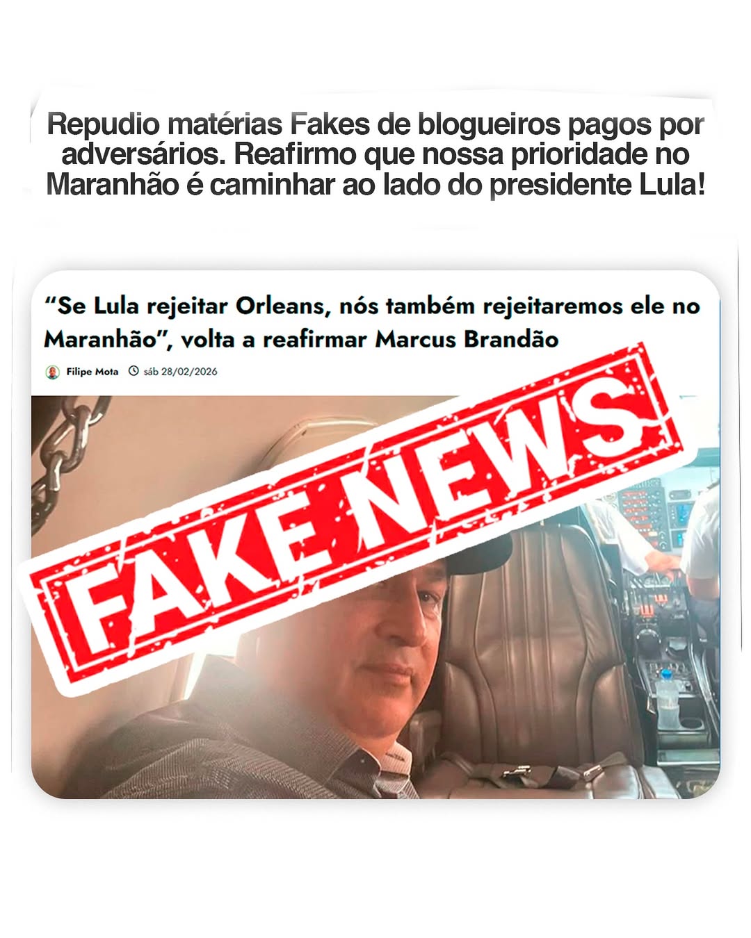 Marcus repudiou uma postagem feita afirmando que ele teria reagido a uma eventual rejeição do nome do pré-candidato ao Governo do Maranhão pelo MDB, Orleans Brandão, pelo presidente da República, Luiz Inácio Lula da Silva (PT).
